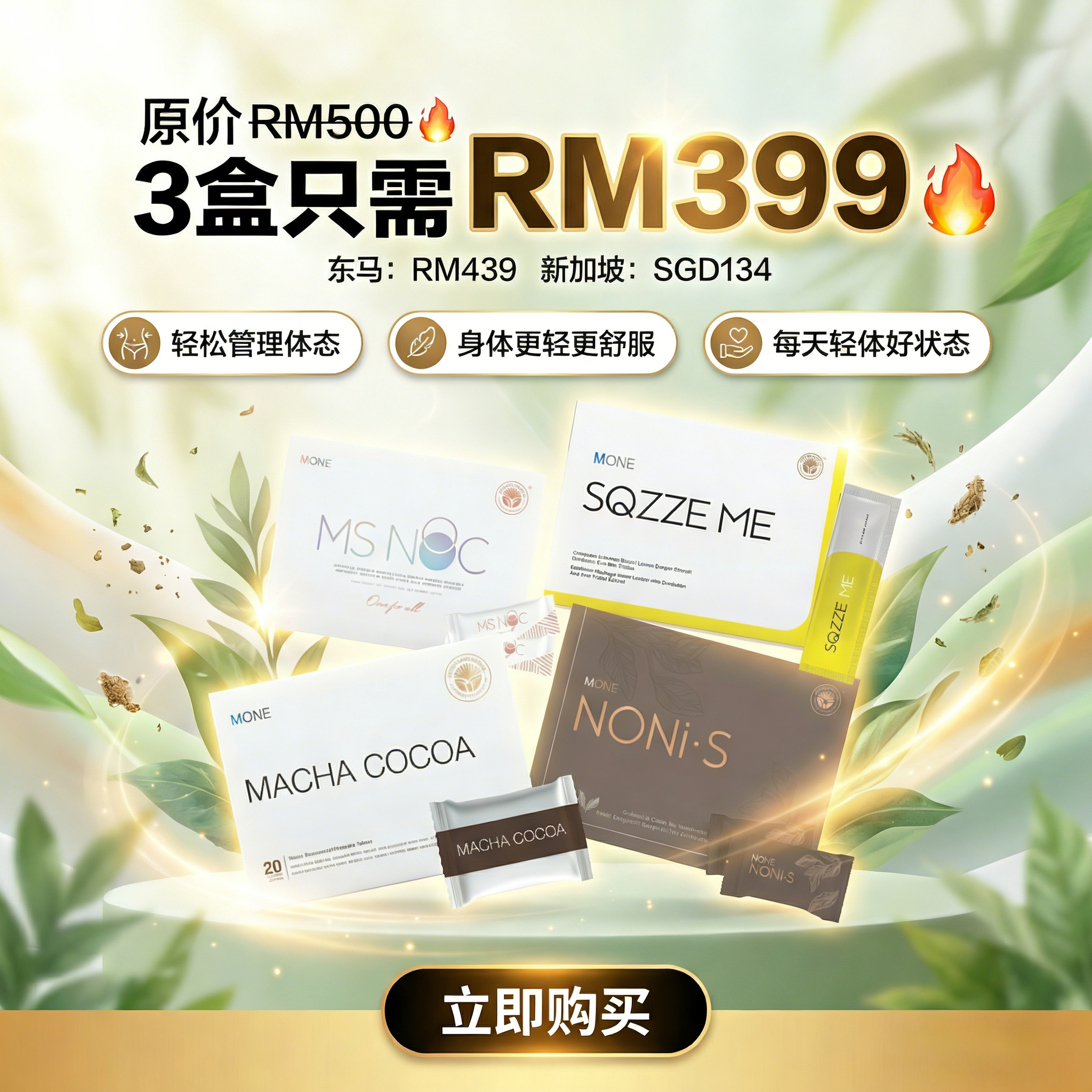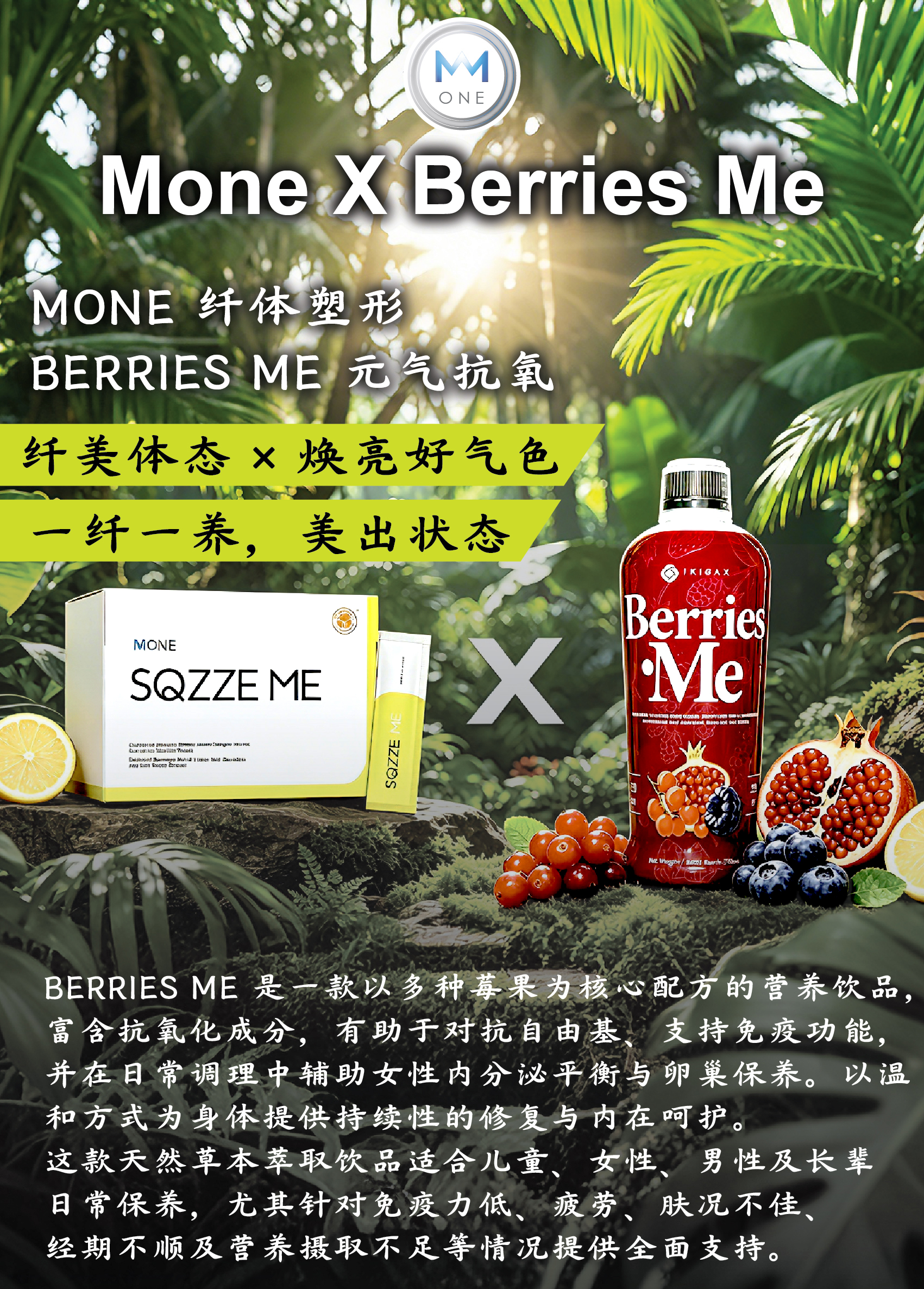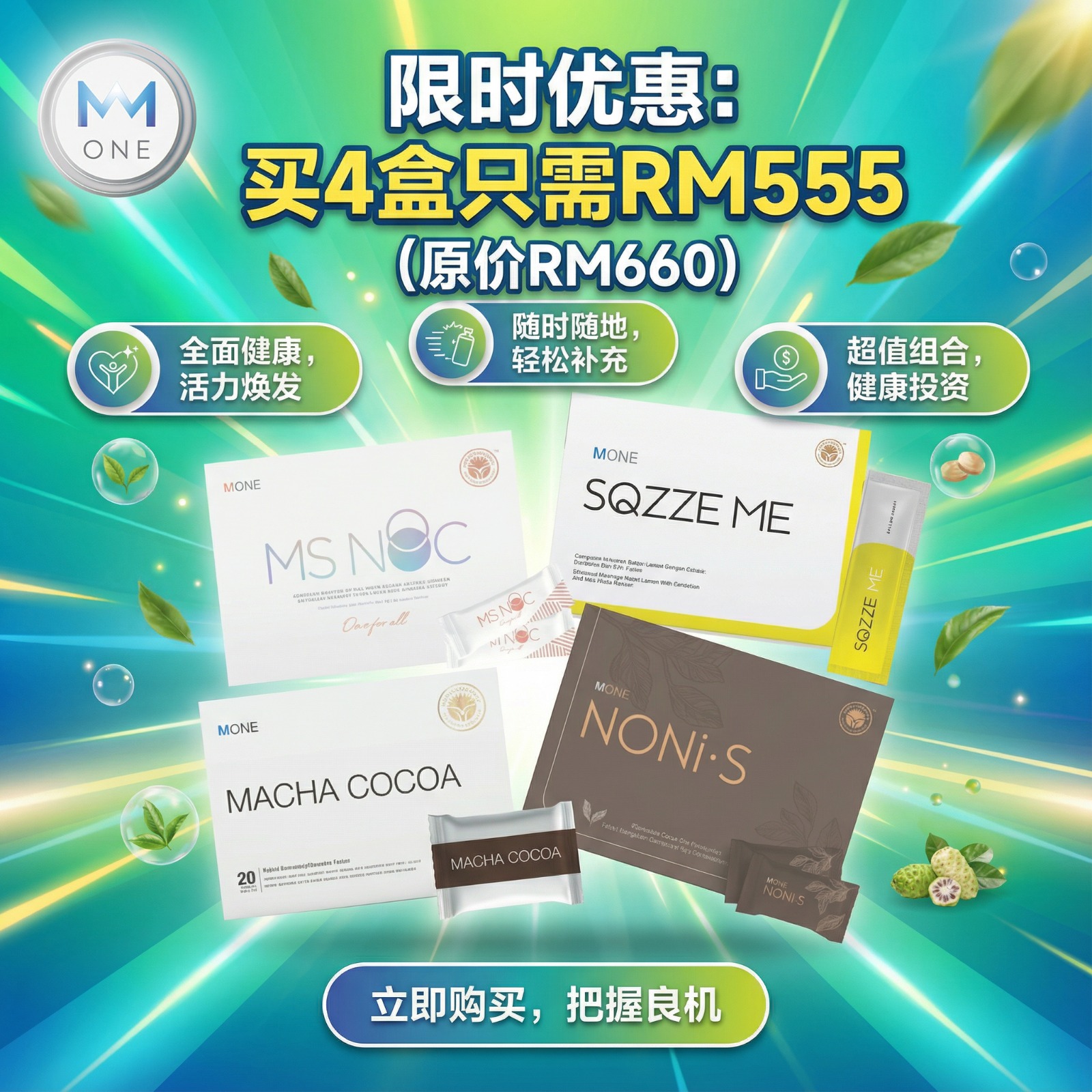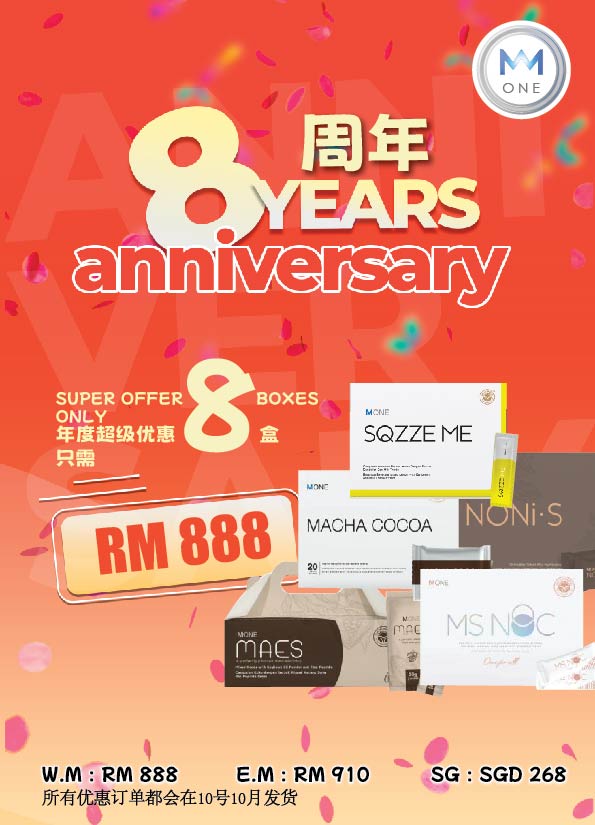每天享用MONE产品等于= 游泳40分钟 = 瑜伽2小时 = 健身操 1小时, 荣获多项国际化验证件机关认KKM, GMP, HALAL, MeSTi, NSF, HACCP SGS, FDA GRAS我们极力研究全方位的健康配方以确保 能提供最完善的营养。秉持着“少既是多”的原理,能够把所有精华 浓缩成一包的产品能够解决盲目选择的烦 恼,也能更加有效的增加营养,生活也变得更 加简易轻松。